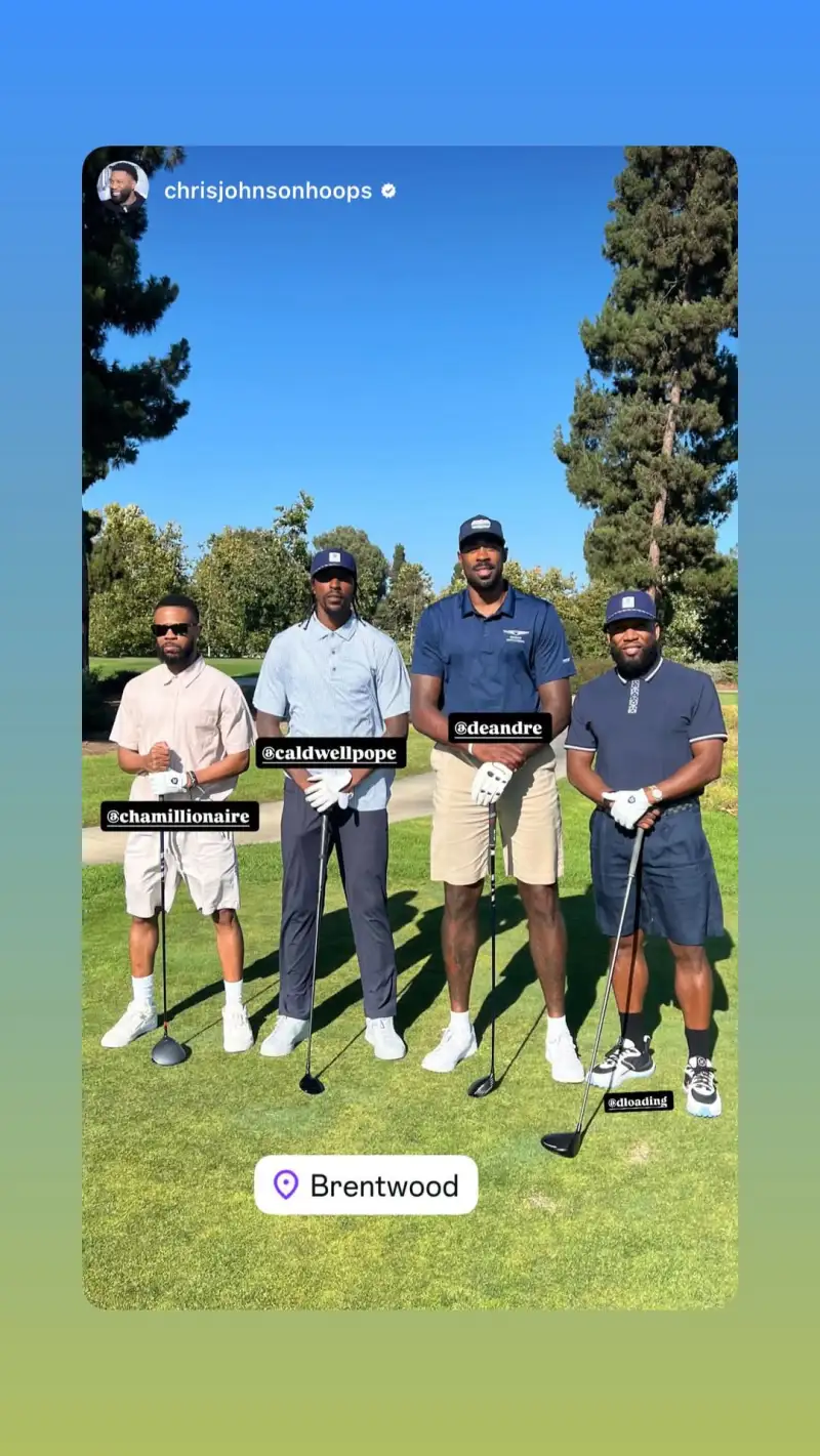 虎扑09月12日讯 灰熊球员卡德威尔-波普更新ins,转发自己与德安德烈-乔丹等人一同在布伦特伍德打高尔夫球的合照。